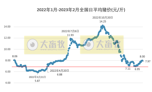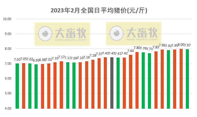 根據(jù)每日豬價(jià)計(jì)算,2023年2月高位豬價(jià)平均7.56元/斤,低位豬價(jià)平均7.27元/斤,高低位平均豬價(jià)7.42元/斤,環(huán)比減少0.2元,下降2.62%,連續(xù)4個(gè)月環(huán)比下降,累計(jì)下降44.5%;同比增加0.92元,增長(zhǎng)14.15%,連續(xù)9個(gè)月同比增長(zhǎng)。