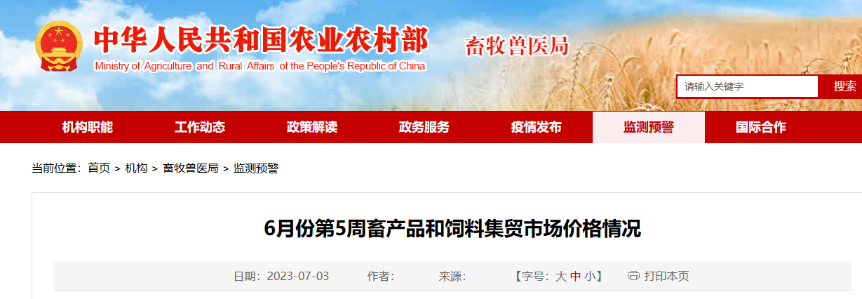 據(jù)對全國500個縣集貿(mào)市場和采集點的監(jiān)測,6月份第5周(采集日為6月28日)玉米價格上漲,生豬產(chǎn)品、家禽產(chǎn)品、牛羊產(chǎn)品價格下跌,豆粕、配合飼料價格持平。生豬產(chǎn)品價格。全國仔豬平均價格33.50元/公斤...